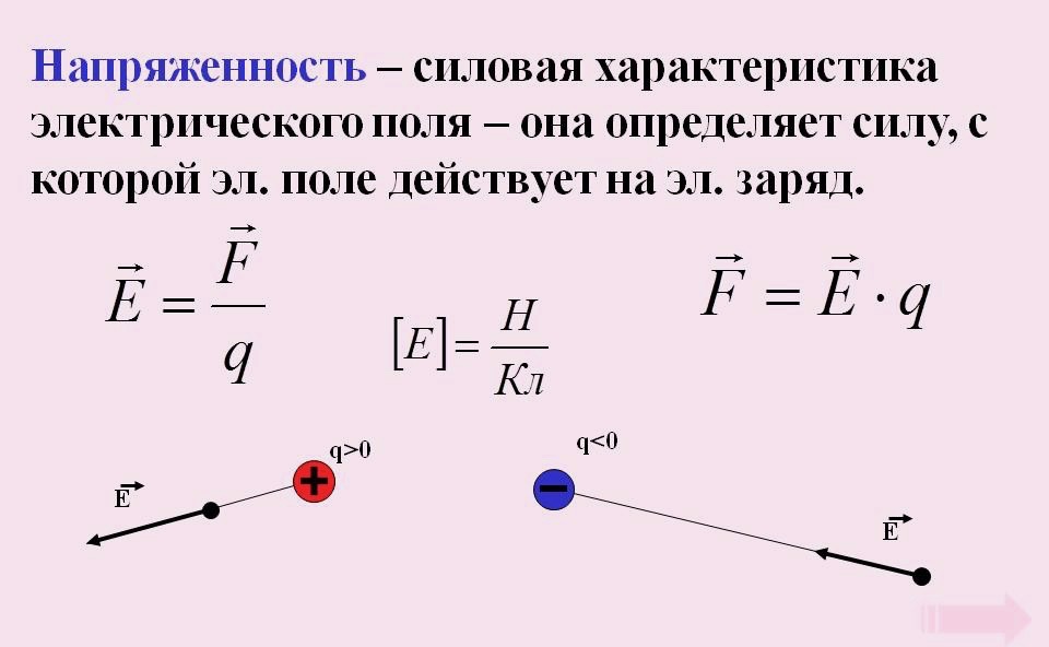 Силовой характеристикой электрического поля является напряженность, которая обозначается буквой Е и имеет единицы измерения или . Напряженность является векторной величиной, так как определяется отношением силы Кулона к величине единичного положительного заряда