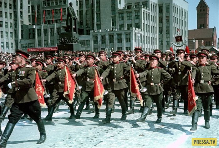 Военный оркестр на параде, приуроченном к празднованию 1-го Мая на площади Ленина (в настоящем времени Независимости).